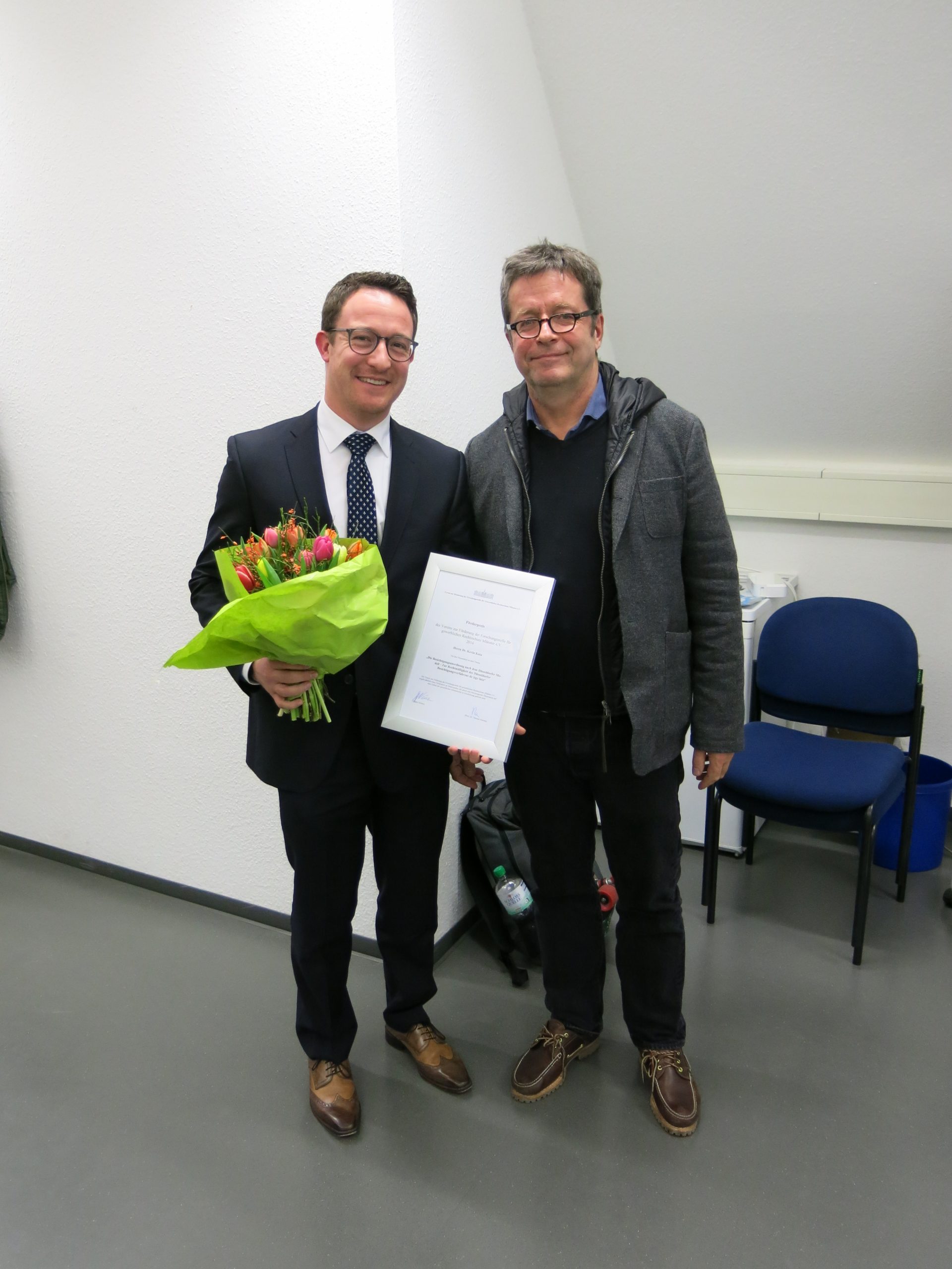 Im Anschluss erfolgte die Zertifikatsverleihung durch Prof. Hoeren und Dr. Jochen Bühling. Dabei wurde auch Herr Dr. Kevin Kuta für seine herausragende Dissertation zum Thema „Die Besichtigungsanordnung nach dem „Düsseldorfer Modell“ – Zur Rechtmäßigkeit des Düsseldorfer Besichtigungsverfahrens de lege lata“ mit dem Förderpreis der Forschungsstelle für Gewerblichen Rechtsschutz ausgezeichnet.