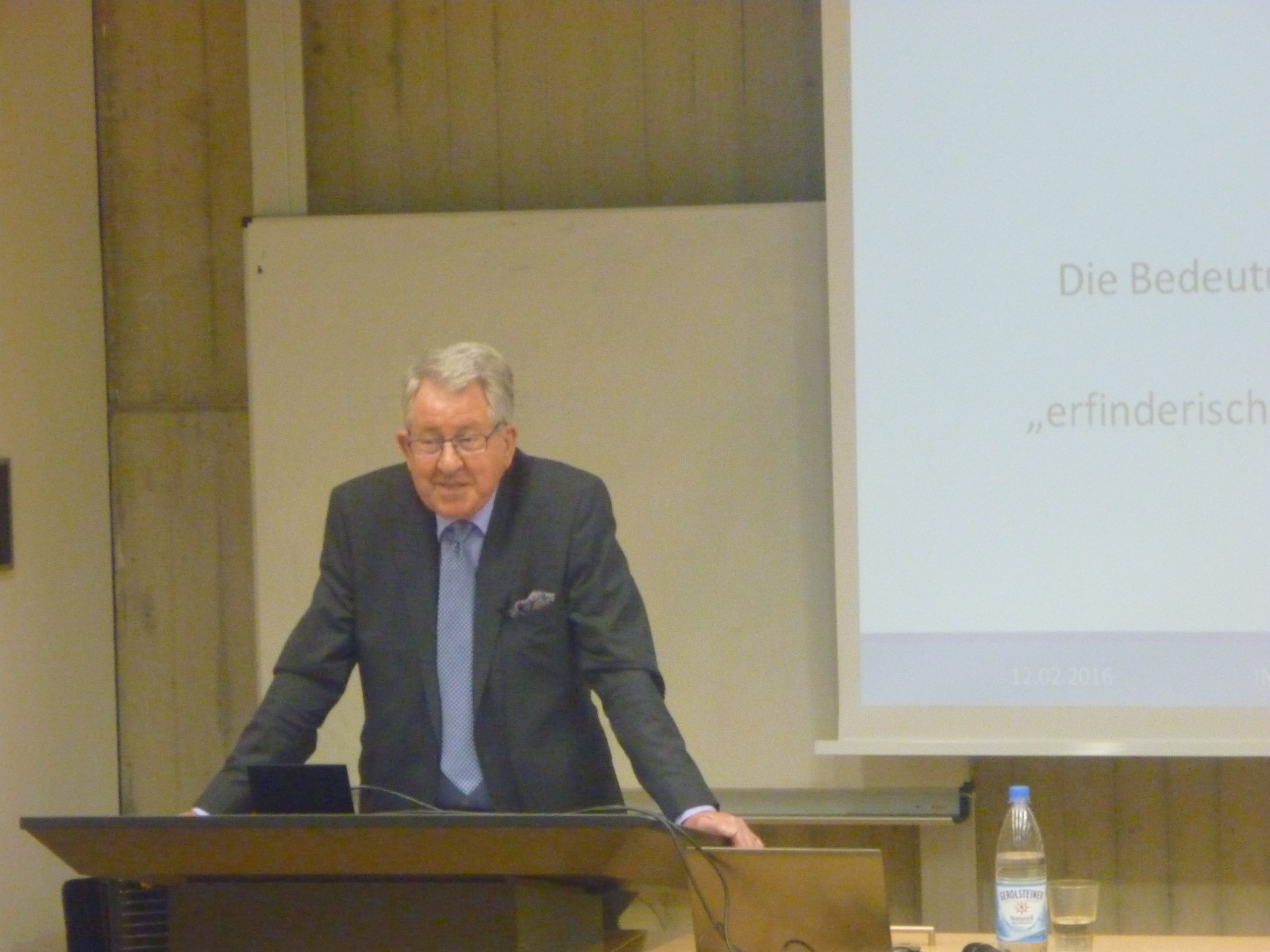 Anlässlich der feierlichen Zertifikatsverleihung der Forschungsstelle am 12. Februar 2016 hielt Prof. Dr. Kurt Bartenbach als Gastredner einen Festvortrag zum Thema „Die Bedeutung der Arbeitnehmererfindung in der betrieblichen Praxis – „erfinderische“ Ideen zur Bestimmung von Vergütungsansprüchen“.