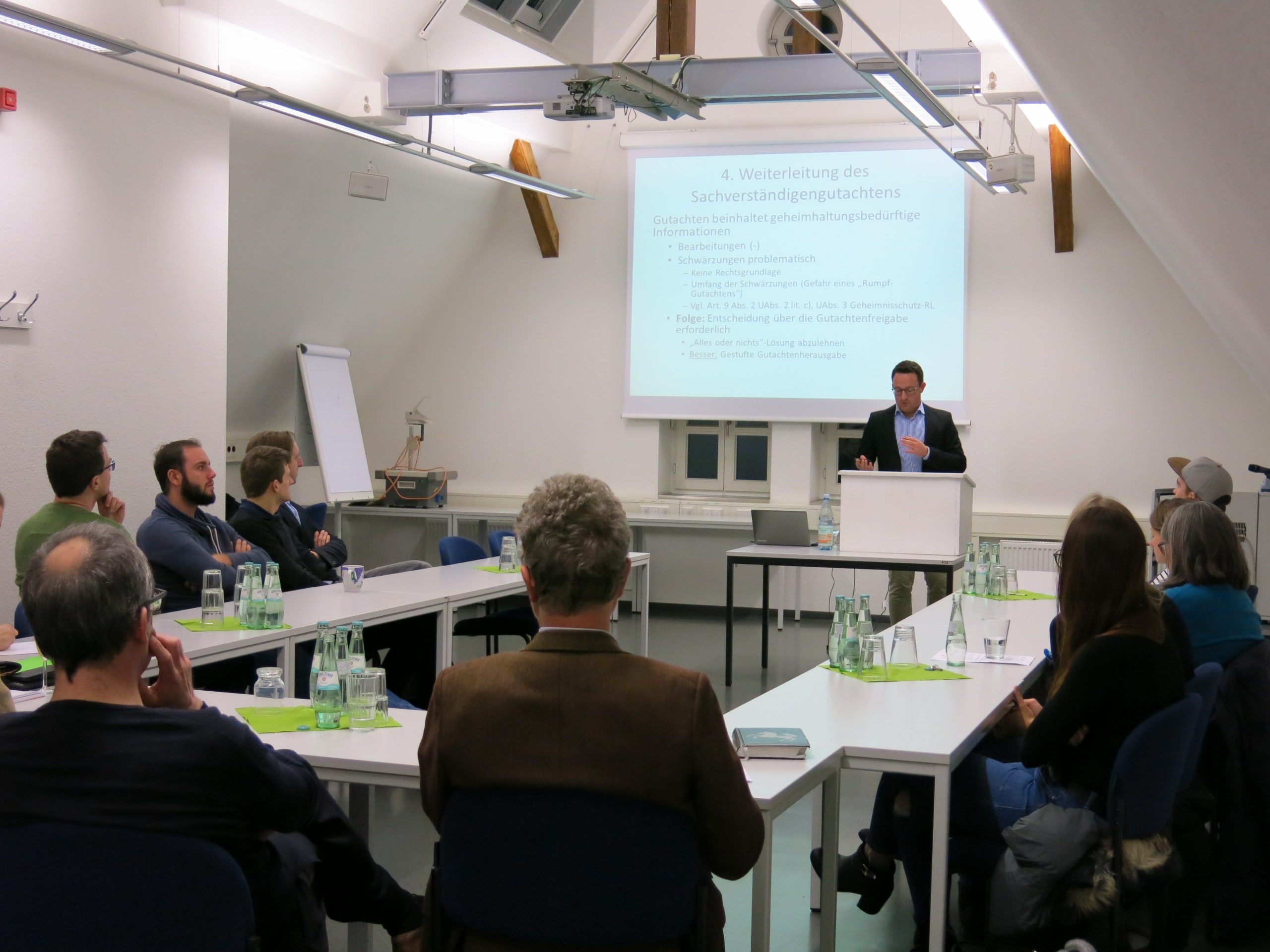 Herr Dr. Kuta, Förderpreisträger der Forschungsstelle, führte in die Probleme ein, die sich bei einer Beweissicherung außerhalb eines Hauptsacheverfahrens nach dem „Düsseldorfer Modell“ ergeben und beleuchtete damit ein Thema, das insbesondere in der anwaltlichen Praxis im Bereich des Gewerblichen Rechtsschutzes von hoher Relevanz ist. Zunächst erklärte Dr. Kuta die Ausgangslage für die Entwicklung des „Düsseldorfer Modells“, die in einem Beweismangel seitens des Antragstellers bei Klageerhebung, insbesondere im betriebsinternen Bereich, liege. Das „Düsseldorfer Modell“ solle dieser Problemlage entgegenwirken, enthalte aber selbst einige Probleme, auf die Dr. Kuta im Rahmen seines Vortrags näher einging.