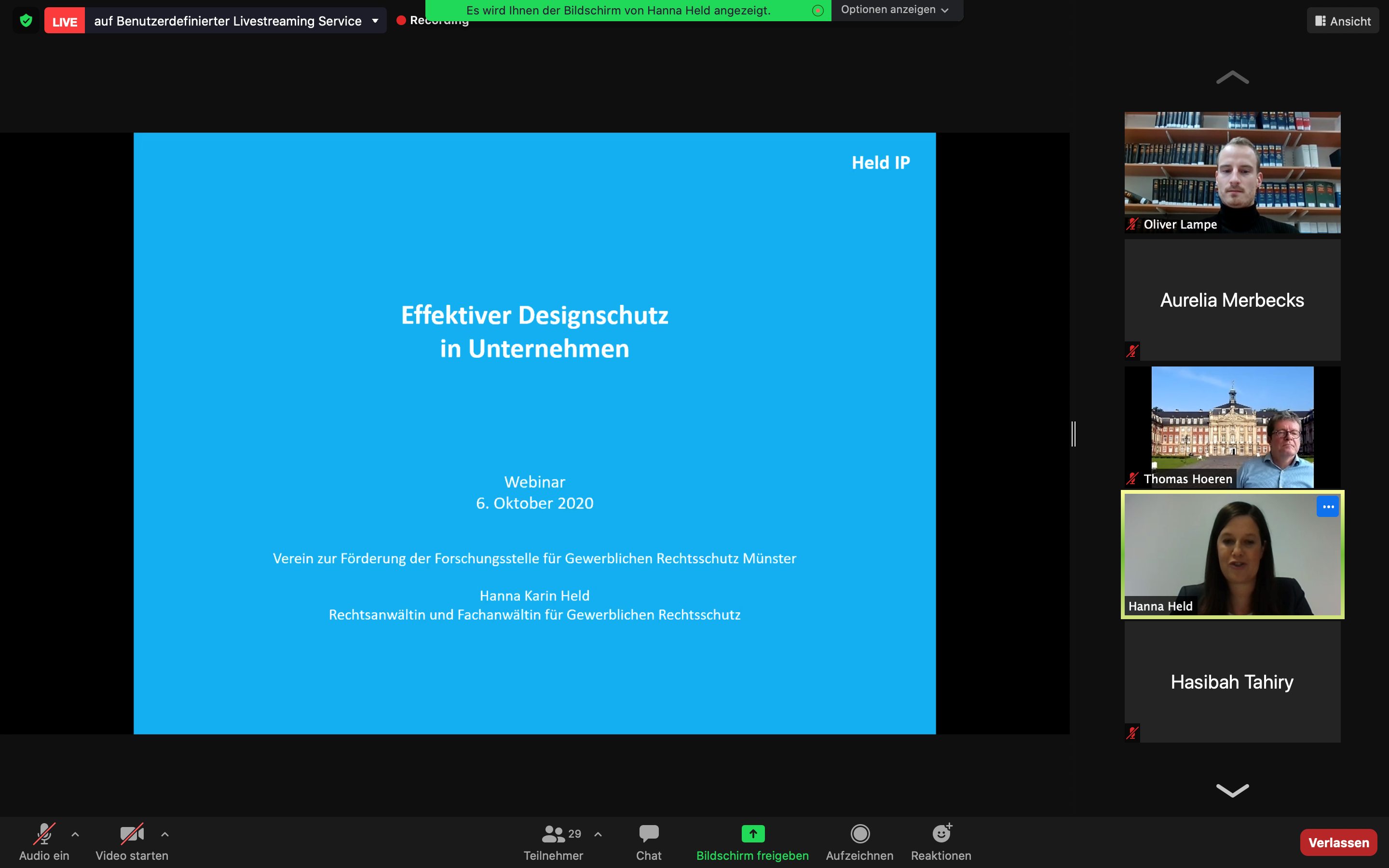 Am 06.10.2020 hat Frau RAin Hanna Karin Held über Zoom einen Vortrag zum Thema „Effektiver Designschutz in Unternehmen“ gehalten. Frau Held ist Rechts-und Fachanwältin für Gewerblichen Rechtsschutz, die seit fast 15 Jahren auf dem Gebiet des Gewerblichen Rechtsschutzes tätig ist sowie einen fachlichen Schwerpunkt auf dem Gebiet des europäischen und internationalen Designrechts hat.